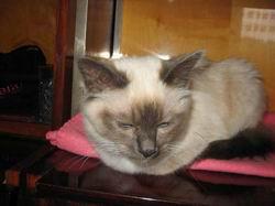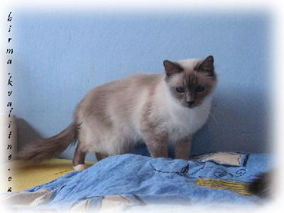 Před dlouhými lety žili v daleké krajině Tibetu mniši vyznávající náboženství Kittah, uctívající boha Song-Hyo a bohyni s nádhernýma safírovýma očima Tsun Kyan-Kse. Ve stínu hory Lugh vybudovali překrásný klášter Lao-Tsun a v něm svatyni zasvěcenou bohyni převtělování Tsun Kyan-Kse.Nejosvícenějším a nejváženějším mnichem byl učený stařec Mun-Ha. Mun-Ha byl zcela oddán službě bohyni Tsun Kyan-Kse, že ostatní mniši věřili, že snad sám bůh Song-Hyo zapletl zlaté vlasy jeho bradky, symbolu pokory.Vždy, když rozjímal před zlatou sochou bohyně převtělování Tsun Kyan-Kse, stál po jeho boku kocour se sněhobílou srstí a žlutýma očima. Jmenoval se Sihn.Tak tomu bylo i jedné noci, kdy byl klášter přepaden hordou nepřátelských barbarů ze Siamu. Svatý mnich Mun-Ha zahynul, ponořen v motlitbách, před zlatou sochou své bohyně se safírovýma očima.Tehdy Sinh vyskočil na trůn a nehybně seděl opřený tlapkami o pánovu hlavu před sochou bohyně. A uskutečnil se zázrak převtělení! Bílá srst kočky se zbarvila zlatým leskem bohyně, žluté oči se změnily na safírové. Obličej, uši, nohy a ocas na sebe vzaly hnědou barvu země. Jen konečky tlap, kterými se kočka dotýkala stříbrných vlasů svého pána, zůstaly čistě bílé, na znamení mnichovi čistoty.Jen jednou Sinh odvrátil své oči od sochy bohyně Tsun Kyan-Kse, směrem k jižní bráně kláštera. Mniši, poslušni znamení bohů, spěchali těžkou bránu uzavřít a zastavit tak další nájezdy lupičů. Chrám byl uchráněn.
